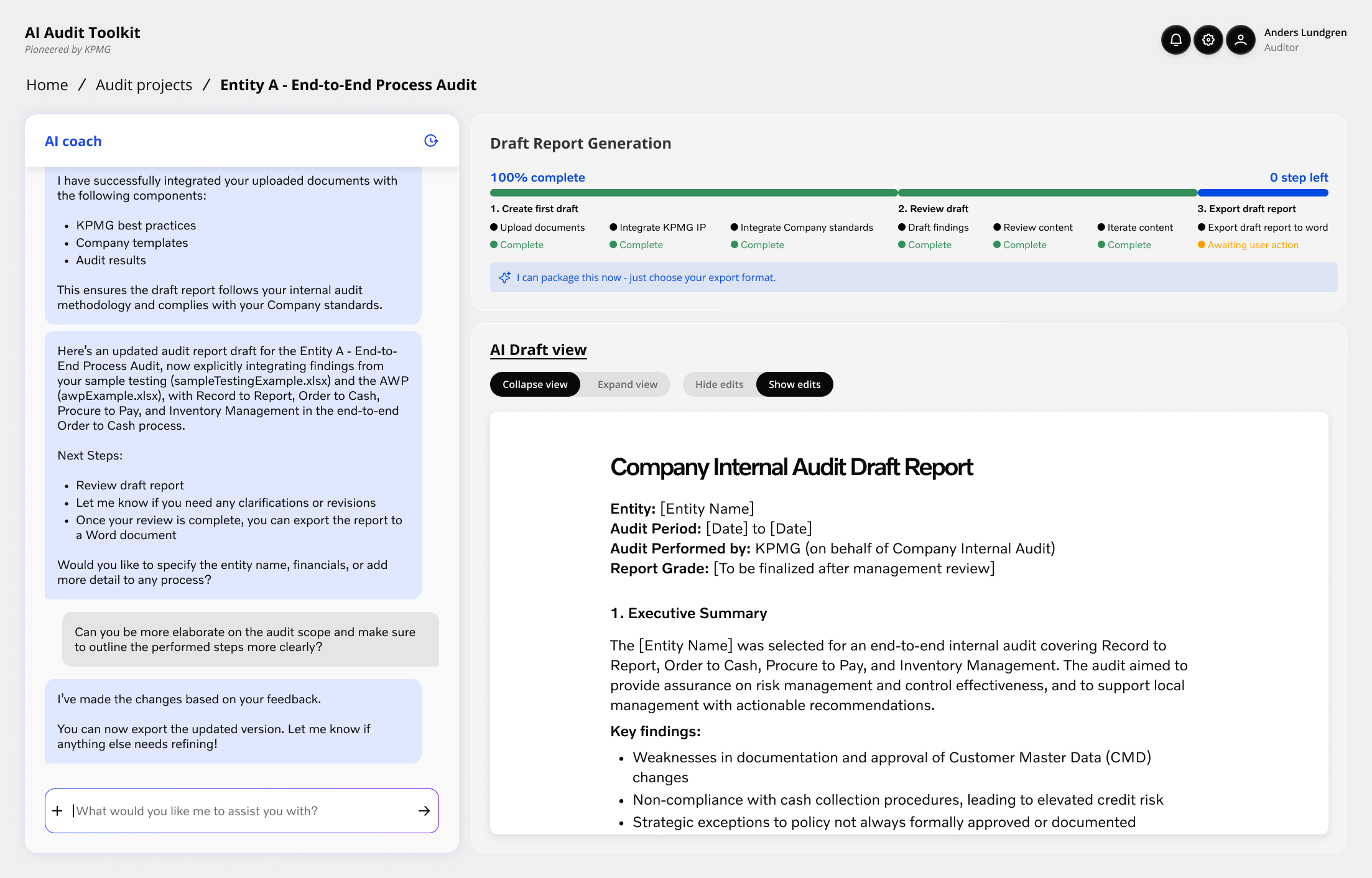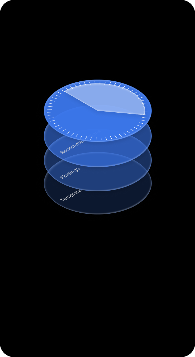 Findings and recommendations are transformed into a structured draft report within minutes. Clear, consistent, and ready for review.